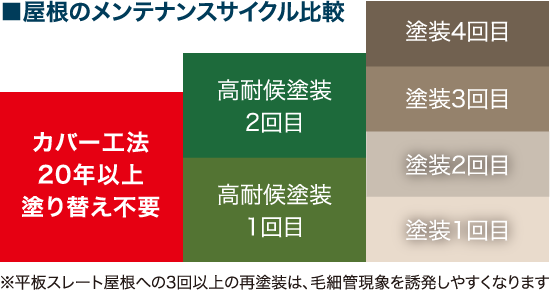 対して葺き替えの場合、スレート屋根なら屋根面積が100㎡で約1.3トンの廃材がでます。さらに、2004年以前に施工されたスレート屋根は、原材料にアスベストを含むことが多く、解体を困難にし、加えてその費用も高額になります。カバー工法なら、この解体・廃材処分費を大幅に削減することができるのです。